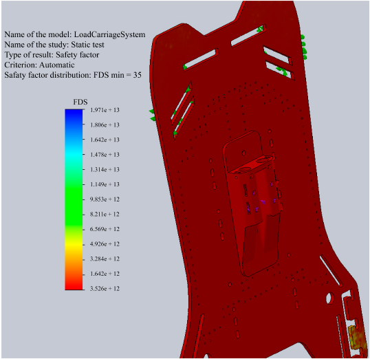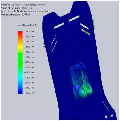 For the assignment of CAD materials, polymers (PLA 3D printing and Polypropylene) were used to manufacture the structure. In addition to an analysis of finite elements (AFE) carried out in Solidworks®, a static analysis was simulated for the structure with a 300 N load that exceeds the maximum magnitude set in vertical direction to the ground for static analysis as shown in Figure 5. The frames were assigned as Polypropylene, (Density: 933 kg/m3; Young´s Modulus: 1.79 GPa; Tensile Strength, Yield: 33 MPa) and the coupling parts were assigned as PLA for 3D printing (Density: 1250 kg/m3; Young´s Modulus: 3 GPa; Tensile Strength, Yield: 49.5 MPa) [16, 17], which couple the fixed frames and suspension.