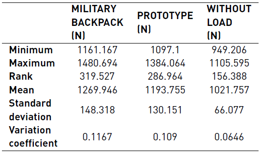 Regarding the maximum value of the TVGRF, there was a reduction of approximately 76 N with the prototype compared to the military backpack. This could offer benefits in terms of the reduction of musculoskeletal injuries caused by carrying loads. The data in Table 2 shows a wider range and standard deviation in the maximum strength of the military backpack, which seems to indicate that the variability in data is greater. This is confirmed by a variation coefficient of 0.116 while the maximum forces measured for the prototype are more homogeneous, with a variation coefficient of 0.109.