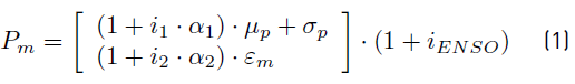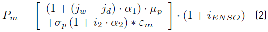 where Pm = projected precipitation; i1 = mean increase; mp: projecting month; α1, α2 = 1/mp = increase coefficient of mean (α1) and/or variance (α2); µp = Monthly precipitation mean; σp = monthly standard deviation; i2 = variance increase; Ɛm = random error N (0,1); iENSO= ENSO index (Niño or Niña).
