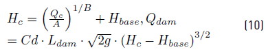 where, Hc = Lateral discharge level of Cauca River (m), Qc = Cauca estimate flow (m3/s), A =Measured flow average (m3/s), B = coefficient assumed by the landfill (1.5). Hbase = heigh in the Cauca riverbed (25 m), Qdam = Floodplain potential income stream (m3/s), Cd = coefficient (0.25), Ldam = overflow length (31 meters).