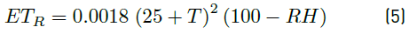 Evapotranspiration: We estimate the evapotranspiration (ET) as a weighted average of two methods: Blaney-Criddle (ETBC ), which use the temperature and a coefficient that depends on the type of vegetation, and Romanenko (ETR ) [18]. The Equation (4) of Blaney and Criddle to estimate evapotranspiration, converted to metric units, is as follows: