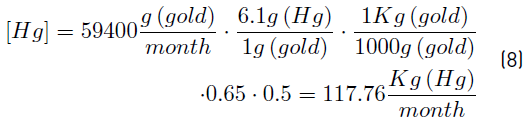 The Colombian mining information system provides monthly data of the actual gold production in Ayapel for the period 2001-2014 [23]. With this information, we estimate the loads of mercury that could enter the Cienaga as a function of a mercury to gold extraction ratio. For instance, an average monthly production of 59.4 kg of gold may produce a load of mercury given by Equation (8):