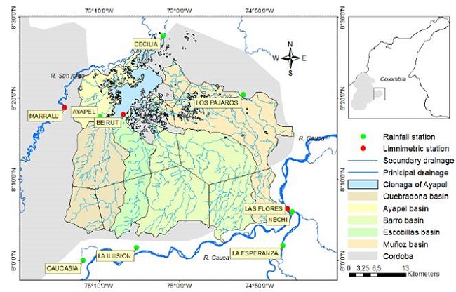 We characterize the monthly hydrology of Ayapel with spatial spline interpolations using Arcgis, employing records from one principal (Ayapel, 1969-2015), six pluviometric (Cecilia, Los Pájaros, La Esperanza, Nechí, La Ilusión, and Caucasia from 1969 to 2015), and three limnimetric stations (Marralú, Beirut and Las Flores, 1974 to 2012) from IDEAM [Figure 1] [9].