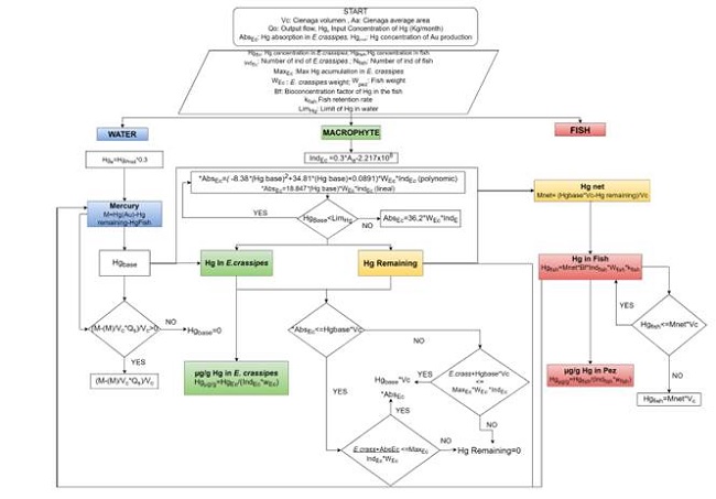 The simplified, fully-mixed model of mercury circulation, allows the conservative estimation of mercury concentrations from an environmentally unsuitable exploitation of gold in the Ayapel basin that could reach not only the water body but also two important ecological compartments, such as macrophytes and fish.