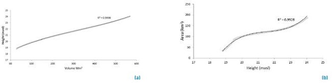 To calibrate and validate our model, we use bathymetric information registered by [29] in 2004 and 2005. Figure 12 shows the topology of Ayapel, using functions which represent the variation of volume (lineal) and area (polynomic) with height. We use historical daily information during the period 1985 to 2010.