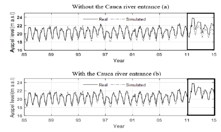 We simulated the series of levels (m), volume (millions of m3) and area (km2) and compared with the historical real series. Volume reaches a correlation of 0.86. Actual level data, obtained from the Beirut station of IDEAM from 1985 to November 2013, reaches a correlation of 0.87. Finally, the area has a correlation value of 0.85. The square corresponds to the imbalance in each of the three series due to levee breakings on the Cauca River. Figure 13 shows the actual levels due to the entrance of the Cauca occurred in 2010, compared to the expected levels under no break condition. In this way, our model allows the evaluation of the expected hydrologic conditions under no levee break. According to the model, the water discharges required by the floodplain to reach the levels observed in the period of the levee break were between 10 m3/s and 70 m3/s (this flow represents only the fraction of the total derivation required to maintain the floodplain level of the water mirror at recorded levels).