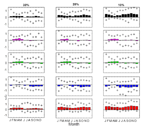 With the model, we project the Cienaga levels for the five proposed scenarios under the conditions of variation of precipitation of 10%, 20% and 30%. For this, we calculate the difference in meters between the monthly historical average level (zero value in the graphs) and the monthly average of the projections (between -1.5 and 2.0).