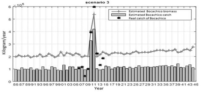 For S3 (“historical”), Figure 15 shows the estimated bocachico catch bar, the expected fish population after the balance and the catch reported from 2005 to 2015 by Colombian fishing Statistic service (SEPEC) and the Agricultural Statistic System (SEA) [32]. The population responds to changes by catch. Population in terms of biomass varies in the historical period from 191,700 kg / year in 1990 to 235,100 kg/year in 2000. With the levee failure, the extractions exceeded the limit over 400,000 kg in the most critical year (2011), which can be interpreted as a piston flow that diverted a population of bocachico from the Cauca River to the floodplain, which was not part of the normal balance. After this event, the estimated catch and populations went to normal and the system recovered its capacity with a negative loop. The concept of a loop is very useful because it allows us to start from the structure of the system to analyze and reach its dynamic behavior [33]. To say that the system has a negative loop is synonymous with finding the dynamic balance in the population.