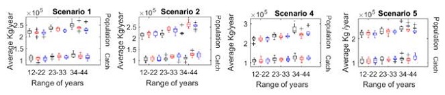 For S1, +10% corresponds to high values in the bocachico population around the 250,000 Kg/year at the end of the period (2034-2044). The condition +20% and +30% show a small increment in population. The extractions remain similar during all the period. Despite a slight increase in the trend, as the rainfall increases, the population percentages appear to be stable. Also, in this scenario, the relation between rain percentage change and fish population is inversely proportional. For S2, a significant change in trends of -20% and -30% is seen in both the population and the catch. The highest population value occurred in the range of year 2034-2044 in -20% where the population exceeded the 250,000 kg/year. The rain percentage is directly proportional to the population and inversely proportional with the catch. The catch does not have significant variation between the range years but maintain the same behavior like the population. In S4, which represents changes in the variance, the behavior between both average projected population and average projected catch presented not significant change. The years ranges 12-22 and 23-33 have similar average for each percent for the population and catch. Only in the range between the years 34-44 the average population biomass exceeds the 250,000 kg/g with the condition of 10% associated to an increment in the catch. In S5, there are not significant differences in the catch during the different periods. The population trend seems not to have been pronounced significantly, only the last one (34-44) appear to increase in the three conditions. Thus, population is able to maintain equilibrium.