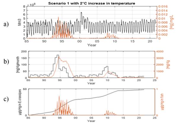 Our model is an attempt to integrate several compartments of relevance in the description of the Ayapel Cienaga. The hydrologic model, for instance, works on the catchment scale, since we determine that the Cienaga responds mainly to the local rainfall and only in extreme cases to the dynamics of the Cauca River. This scale is also adequate to integrate the fish dynamics that respond synchronically to the Cienaga flood pulse. The incorporation of mercury from local mining practices can also be described in monthly intervals, given the bioaccumulation rates in the native macrophytes and fish, and considering the conservative nature of the pollutant once incorporated to water and sediments. In this regard, our model describes an aggregated, conservative approach, to these balances. The model does not provide detailed descriptions of groundwater recharge, or inner hydrodynamics of the Cienaga, which require information on more refined scales. The model does not consider the impact of increasing temperatures on the metabolism of fish (reproduction and mortality rates), which may also decrease the expectations of fish population in the proposed scenarios. Furthermore, it is important to clarify that our model does not consider the impact of the Hidroituango dam on fish populations downstream, or in the likelihood of extreme floods, which is still a subject of discussion and may alter considerably the results projected in our scenarios. Nevertheless, the conceptual framework and outcomes of this model may serve as a baseline for further models at other scales, and as an aid for decision-makers and academicians concerned by the environmental management and protection of the Cienaga.