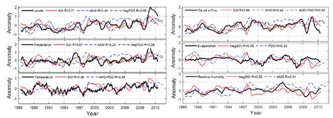 The Cauca River flow has the highest correlation with SOI (0.69), and lower with AMO and AMO-PDO combination (0.44 and 0.53 respectively). Evaporation shows its higher correlation with the negative phase of SOI (R=0.35), although the extreme values in this oscillation do not directly influence this variable. The relative humidity of the Cienaga showed a better correlation with the AMO oscillation (R=0.31) than with SOI.