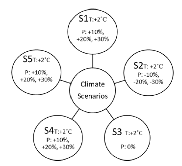 We evaluate the critical conditions in the Cienaga through five scenarios, using an increment of 2˚C in temperature in all of them and several conditions for precipitation [Figure 4]. Scenario 1 (S1) represents an increase in precipitation average. Scenario 2 (S2) represents a decrease in precipitation average. Scenario 3 (S3) represents a normal condition, with no variation in precipitation average and variance. Scenario 4 (S4) represents an increase in precipitation variance. Finally, Scenario 5 (S5) represents an increase in wet months and a decrease in dry months. In addition, each scenario has an increment or decrement (10%, 20% and 30%), based on different future projections.