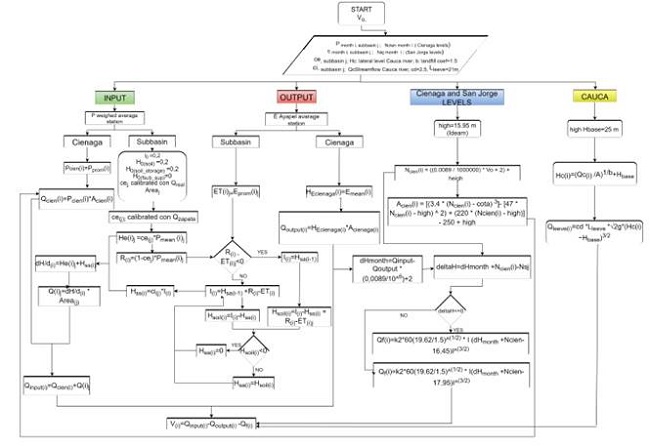 We estimate the monthly water balance in Ayapel from the inflows and outflows derived from precipitation, evapotranspiration, infiltration, runoff and stream and subsurface flows through a two-tank model applied over each of the five watersheds in the Cienaga. Water enters as precipitation in the first tank and leave subsequently in three fractions: evapotranspiration, direct runoff (established by means of a rainfall-runoff coefficient), and as seepage through the second tank that controls the amount of water that comes out as subsurface flow each month. The inflow to the Cienaga is the combination of runoff and subsurface flow. Figure 5 shows a flow diagram of inputs and outputs for the calculation of the monthly water balance of the Ayapel Cienaga. The balance has four main flow components: inputs, outputs, Ayapel and San Jorge levels and the Cauca River flows. The San Jorge River controls the outflow from the Cienaga to the north, whereas the Cauca River floods the Cienaga due to levee breaks.