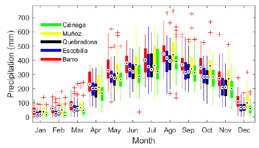 Increase in variance (S4) does not seem to have a decisive influence on these differences, especially from June to December, when high rainfall occurs in the Cienaga. For S5, which establishes a variation in the extreme values of rainfall, the projected averages surpass the historical average in most months, which indicates that the levels maintain an equilibrium despite the water deficit in dry months, possibly due to the connections with flows and streams that enter the Cienaga. Hence, the Cienaga is able to buffer the extreme conditions under these two scenarios. The extreme values correspond to those upper and lower monthly peaks in the levels.