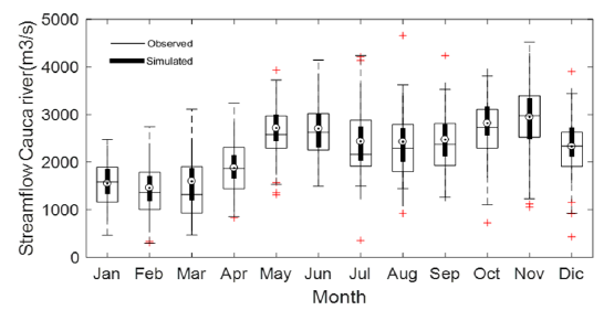 Cauca River flows: We calculate discharges from the Cauca River using an ARMA (1,1) equation similar to 3 with information of Las Flores station of IDEAM between 1974 and 2012, as shown in Figure 8. We generate random series with a Monte Carlo procedure to calculate correlation coefficients between observed and simulated data. We chose for the analysis the series that presented the highest correlation value.