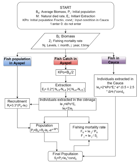 There is an important relationship between fish population, seasonal catches and wetland levels. Levels in the Cauca River, for instance, have been linked to human activities, in particular the capture of a fish of commercial importance called Pyaractus brachypomus, commonly known as "cachama blanca" [12]. We considered bocachico (Prochilodus magdalenae), which has the highest commercial value in Ayapel [13], as a representative species to study fish population dynamics in Ayapel. We established a directly proportional relationship between levels and population for bocachico fish in the Cienaga.
