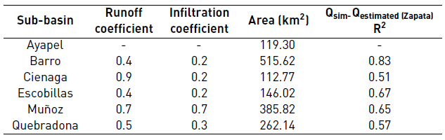 We calibrate our two-tank hydrologic model [Figure 5] and compare our flows with those simulated by [28] in 2015. Table 4 shows the infiltration and runoff coefficients per catchment [28].