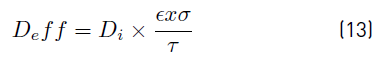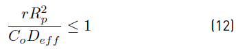 Where r is the reaction rate and Rp is the particle radius. The effective diffusivity, Deff , was calculated from the molecular diffusion coefficient Di , porosity ϵ, tortuosity τ and σ is the constriction factor as described in Equation (13).