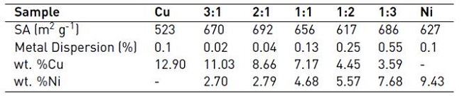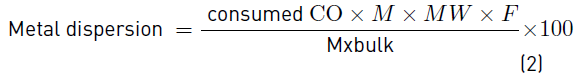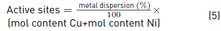 Consumed CO = quantity of consumed or chemisorbed CO [mol g-1]; M = mass of the catalyst [g]; MW = molecular weight of metal (Cu or Ni) [g mol-1]; F = stoichiometric factor (CO:Cu 1:1 and CO:Ni 1:1); and, Mxbulk = mass metal (Cu or Ni). In bimetallic catalysts dispersion was calculated as the sum of Cu and Ni dispersion.
