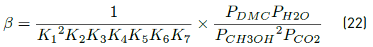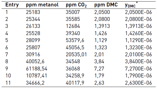 Experimental results may help to clarify the proposed reaction mechanism of the direct synthesis of dimethyl carbonate from carbon dioxide and methanol, Figure 7. Specifically, a Langmuir-Hinshelwood mechanism that includes carbon dioxide and methanol binding to the catalyst in separate steps, as it was suggested in kinetics studies of the liquid phase DMC formation [30], is consistent with the experimental results. The large K5 value suggests the irreversibility of the surface reaction. The estimated apparent activation energy was 94.2 kJ mol-1.