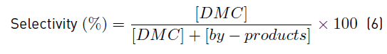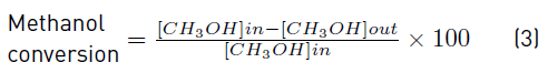 Catalytic tests were performed in a continuous stainless steel (SS) tubular fixed-bed reactor (ID 7 mm) packed with 0.5 g of catalyst sample. Methanol vapor was introduced into the reactor by a stream of CO2/He flowing through a SS bubbler containing the liquid alcohol. All reactions were carried out for 3 h at 90°C, 13 bar and total gas flow was about 50 mL min-1 (actual flow rate at reaction conditions). Products were monitored online by a mass spectrometer QMS Thermostar 200 (Pfeiffer) with a resolution of 0.01 ppm. Catalytic activity was calculated by methanol conversion (Equation (3)], turn over frequency (TOF) (Equation (4)] that requires active sites calculation (Equation (5)], selectivity (Equation (6)] and yield (Equation (7)].