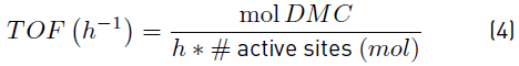 Figure 1 shows the catalytic activity of monometallic and bimetallic samples in terms of MeOH conversion and DMC yield (a), and TOF number (b); no conversion was observed in the bare support.