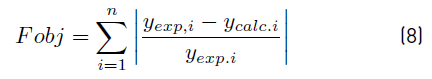 A genetic algorithm (GA) was implemented for parameter fitting; the calculation routine was developed using MATLAB R2008b. Minimization of the difference between the calculated DMC mass fraction ycalc and the experimental DMC mass fraction yexp was the objective function for the GA. The optimal solution was the vector of variables that minimized the objective function (Equation (8)], defined as the sum of the absolute value of relative deviation between the experimental molar fraction (yexp,i ) and that calculated from the kinetic equation (ycalc,i, Equation (9)]; n is the number of experiments (n=11) [32]. Experimental data for this evaluation are given in Table 2.