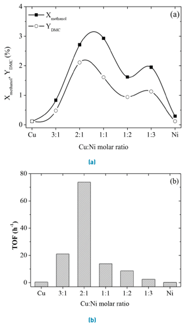 Bimetallic catalysts display higher conversion and DMC yield than the monometallic ones. Since conversions in the monometallic catalysts were too low, the presence of the second metal is needed to achieve significant activity. Moreover, both conversion and yield follow similar trends with two peaks of activity, for the catalysts with Cu:Ni ratios of 2-1 and 1-3. The best catalytic activity is achieved for an intermediate content of Cu, i.e., for the 2-1 ratio. TOF values, Figure 1 (b), are a better indicator of catalyst activity since they account for the number of active sites of Cu and Ni present in each sample. Similarly to the trend of methanol conversion and DMC yield, Cu/AC or Ni/AC monometallic catalyst displayed very low TOFs. Furthermore, TOF values are much larger in bimetallic catalysts, implying that the synergistic effect of Cu and Ni likely plays a significant role. Catalyst Cu:Ni with a molar ratio of 2:1 showed the highest TOF (73.8 h-1), conversion (2.71%) and yield (2.11%). Selectivity to DMC was above 80%; the main by-products were dimethyl ether (from activation species of methanol) and carbon monoxide (from the cleavage of C-O bond of carbon dioxide), in agreement with [21].
