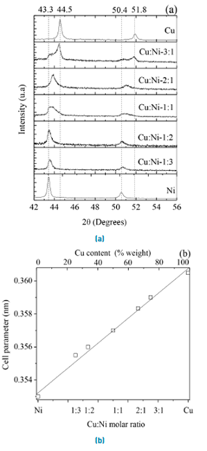 Indeed, for the bimetallic samples, the diffraction lines corresponding to (111) and (200) Miller indices shift linearly with Cu loading. The increase in the lattice parameter as a function of the Cu concentration, Figure 2(b), follows Vegard’s Law, i.e., the linear relationship between the lattice parameter of an alloy and the concentration of the two components is an indication of the formation of a Cu-Ni solid solution in the composition range studied [38]. The presence of a Cu-Ni alloy may account for the increased catalytic activity for DMC formation observed with the Cu:Ni molar ratio.