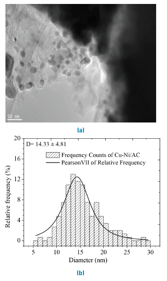 Figure 3 presents the TEM images of Cu:Ni-2:1 catalyst with the corresponding particle-size distribution (distributions were fitted with Pearson VII function). The TEM image shows some differences in the morphological characteristics of metal particles. Most particles adopt spherical shape but some particles with rectangular, elliptical and irregular shapes are also observed in both monometallic and bimetallic samples. Generally, metal particles are uniformly dispersed over carbon surface for monometallic samples, whereas particle agglomeration could be observed with Cu-Ni catalyst.