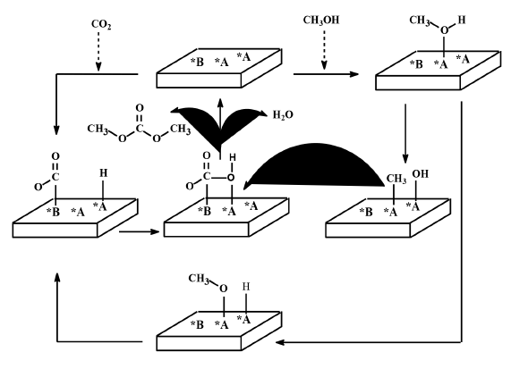 The proposed reaction mechanism is represented in Figure 4. A non-competitive adsorption is assumed, i.e., methanol and carbon dioxide would interact with different types of active sites *A and *B (where *A and *B could be Cu, Ni, or Cu-Ni alloy). Dissociative adsorption of methanol, which would provide the bidentate methoxy, methoxide, and hydroxyl groups is represented by Equations (14), (15) and (16), these results are in agreement with [45] who provided experimental FTIR evidence for participation of methoxi and methoxide intermediates in the thermal decomposition of methanol. The adsorption of CO2 as mono/bidentate carboxylate is depicted by (Equation (17)], which has been reported as a typical bonding of carbon dioxide at a transition metal center [46]. Reaction of the carboxylate and methoxy species to produce monodentate methyl carbonate is given by Equation (18). Then, reaction of methoxide species and monodentate methyl carbonate yields dimethyl carbonate and releases two “type A” active sites and one “type B” active site, Equation (19). Finally, water is obtained by reaction of adsorbed hydroxyl and hydrogen groups, Equation (20).