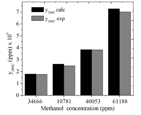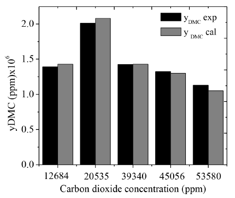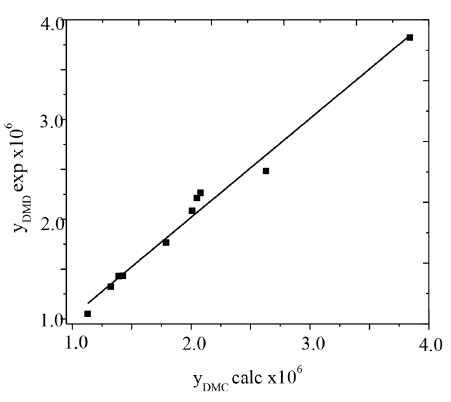 The parity plot presented in Figure 7 shows no systematic deviations between the experimental and calculated dimethyl carbonate concentrations. Accuracy of model predictions supports the proposed mechanism as a good representation of the reaction steps.