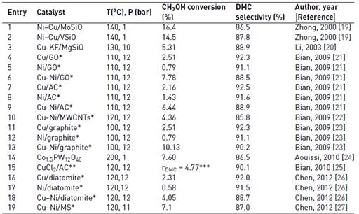Dimethyl carbonate (DMC) has a wide range of applications, such as organic solvent [1], raw material in the production of polyurethanes and polycarbonates [2], methylating [3] and carbonylating agent [4], electrolyte solvent in lithium batteries [5], and fuel additive [6]. DMC is produced by several catalytic routes including phosgenation of methanol [7], transesterification of urea and methanol [8], oxidative carbonylation of methanol [9], transesterification of ethyl carbonate and methanol [10], carbonylation of methyl nitrite [11], and methanolysis of carbon dioxide. The direct synthesis of DMC from CO2 and methanol is a green chemical route that would replace toxic and corrosive reagents, such as phosgene, ammonia, carbon monoxide, hydrogen chloride or dimethyl sulphate, by low-cost carbon dioxide. However, the direct synthesis of DMC is thermodynamically limited and low yields are obtained, which can be overcome, respectively, with the efficient removal of water from the reaction mixture (e.g., by using hydrophilic membranes or water traps), and the design of novel catalysts. Catalytic synthesis of dimethyl carbonate from methanol and carbon dioxide have been carried out over K2CO3 [12], CH3OK [13], ZrO2 [14] ZrO2-CeO2 [15], CeO2 [16], Al2O3-CeO2 [17], and Ga2O3/CexZr1−xO2 [18] catalysts. The batch reaction is conducted at high pressure (4 MPa) in almost all cases, however, increasing operational costs. A gas-phase process, on the other hand, would facilitate process control and catalyst recovery, reducing operational and capital costs and smoothing the scaling-up of a continuous process. Table 1 shows the activity and reaction conditions reported for gas phase synthesis of DMC with heterogeneous catalysts.