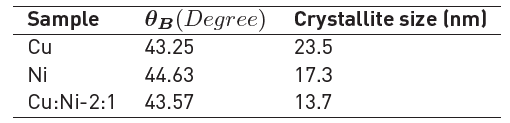 An area survey allowed to extract a particle-size distribution, showing that individual particles consisted of small nanocrystals with an average diameter of 14.33 nm for Cu, Cu-Ni alloy particles, in agreement with XRD results. The mean diameter obtained for Cu-Ni alloy is close to a simple addition between diameters of individual Cu and Ni particles, indicating a possible incorporation of Ni into Cu structure or proximity between particles.