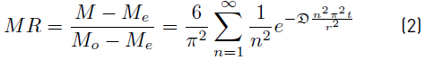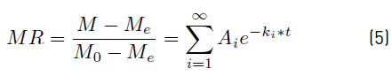 which is a sum of decreasing exponentials, where MR is the dimensionless moisture relation, M the moisture of the grains under test at time t, Mo the initial moisture of the grains, and Me the equilibrium moisture, all measured in dry-base. On the other hand, r is the radius of the sphere in millimeters and the effective coefficient of diffusion, in square millimeters per minute for the samples dried in an electric oven and for the samples dried in a microwave oven.