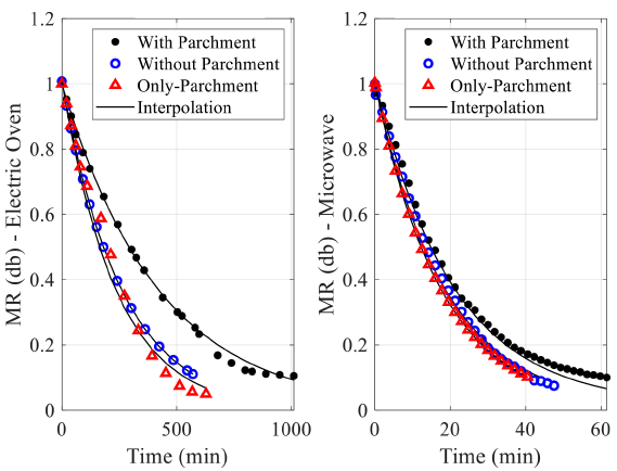 Figure 1 compares drying curves from the electric oven (left subplot), and from microwave (right subplot). In both cases, a decreasing exponential drying curve is evidenced. However, microwave-based drying allows faster processing. While it may take 17h to reach a value below 12% (db) with the conventional oven (grains with parchment), doing so with microwaves only requires about 1h. It is worth mentioning that this time considers times between radiation (1.5min), as well as the duration of each radiation. For the case of grains without parchment, average times of 10h and 40min, are respectively required. Hence, microwave-drying is 17 and 15 times faster on grains with and without parchment, respectively. For both drying methods (thermal and using microwaves), the drying time of only-parchment is very similar to the drying time of grain without parchment, although, the former is smaller.