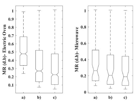 Figures 1 and 2 show the variation of dimensionless humidity ratio (MR). In the first case, the variation is given with respect to time. In the second one, variation is given in the form of boxplots (whisker charts). Figure 3 shows the drying rate with respect to time. Figures 1 and 3 were generated using the average values of all tests and for each class of experiment. Oppositely, Figure 2 was created using a projection of the average drying model found for each experiment. Intervals of 700 and 60 minutes were considered for the electric oven and for microwaves, respectively.