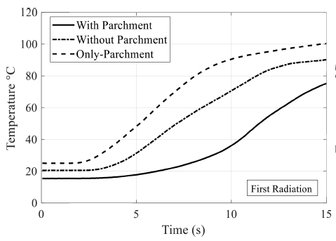 The above circumstance was corroborated by measuring the surface temperature of a grain sample and of parchment. As aforementioned, we used high precision optical sensors. Figures 6 and 7 show that samples can exhibit temperatures of 80°C and 90°C, for grains with and without parchment, respectively. This happens when the cavity is activated for the first and second radiation. In Figure 6, "first radiation" refers to the measurement of the surface temperature of the grains, in the microwave oven, during the first radiation of 15 seconds. In Figure 7, "second radiation", refers to the measurement of the surface temperature of the grains, in the microwave oven, during the second radiation, also with a duration of 15 seconds. We allowed a time-lapse of one and a half minutes between radiations.