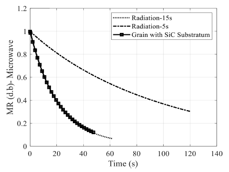 Drying experiments with a shorter radiation time (5 seconds) were carried out (see Figure 8], achieving temperatures in the samples close to 63°C, but with final humidity percentages close to 30%, a value that is high with respect to the final moisture value required for coffee grains (between 10% and 12%, db). As an additional experiment, we added a substrate of Silicon Carbide, SiC, at the base of samples. The effect was a drying curve with the same MR loss pattern, but with higher temperatures. Figures 8 and 9 summarize the data and compare them to the drying of grains with parchment (15-second radiation). The former was obtained by averaging real values of the four tests performed, for each type of experiment. As in the case of Figure 2, Figure 9 results from a projection of the average drying model found for each experiment. But in this case, it was done for an interval of 70 minutes.