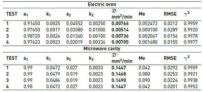 Diffusion coefficients of microwave-based experiments were higher than those from the electric oven experiments. On average, the diffusion coefficient for grain with parchment was 22 times larger when using microwaves than when using thermal radiation. Similar behavior occurred for grain without parchment. On this occasion, the diffusion coefficient increased 15 times. This did visible that removing the parchment improves diffusion coefficients. The average coefficient increase was 1.12 and 1.7 for microwaves and electric oven, respectively.