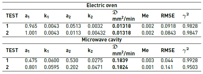 The parameters of Equation (5), found by means of the Nelder-Mead optimization algorithm for each drying experiment carried out, as well as the calculation of the diffusion coefficients, are detailed in the following tables [Table 1-4).