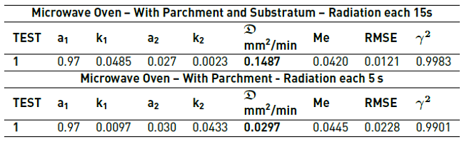 On the other hand, the diffusion coefficient of the parchment was 1.1 and 1.14 times greater than the average diffusion coefficient of dried grains without the parchment, for microwaves and electric oven, respectively. Likewise, the coefficient of grains dried in the microwave cavity with radiations of 5 seconds, was 80% lower than the coefficient of grains dried with radiations of 15 seconds. Adding a substrate to the base of the dish on which the samples were dried increased diffusion coefficient by 2%.