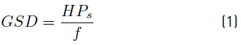Using the Parrot Sequoia multispectral camera with sun lighting in the morning of a clear day, images of the sugarcane leaf samples were taken. The distance between the camera and the leaves was approximately 1.5 m, which gives a resolution at ground level, or ground sample distance (GSD), of 1.4 mm per pixel. The GSD determines the spatial resolution of the images. This is defined as those fine details that can be captured by the images or what portion of the ground can cover a pixel of the image. The smaller the GSD in a digital image, the smaller the details that can be captured and the greater the spatial resolution. According to [37], this distance can be calculated using Equation (1),