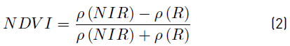 The normalized difference vegetation index (NDVI) is used to extract vegetation abundance from remote sensing data by isolating the dramatic increase in reflectance over the visible wavelengths from red ρ(R) to the reflectance from near infrared ρ(NIR), and normalizes it by dividing by the total reflectance of each pixel at those wavelengths using Equation (2).