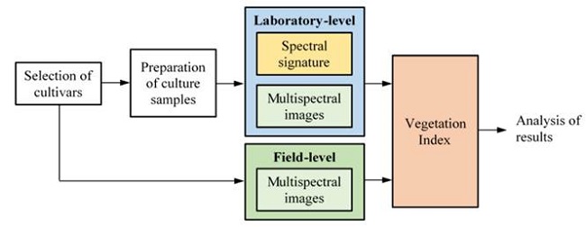 As mentioned above, this study begins with the identification of the spectral reflectance signature of brown rust (P. melanocephala) and orange rust (P. kuehnii), which contaminate sugarcane crops (Saccharum spp.). Our methodology focuses on the identifying of spectral bands capable of differentiating between healthy and contaminated leaves. These bands were finally used to obtain multispectral images, which allows the calculation of a vegetation index capable of distinguishing the difference between the presence and absence of rust. To do this, we follow the steps below: