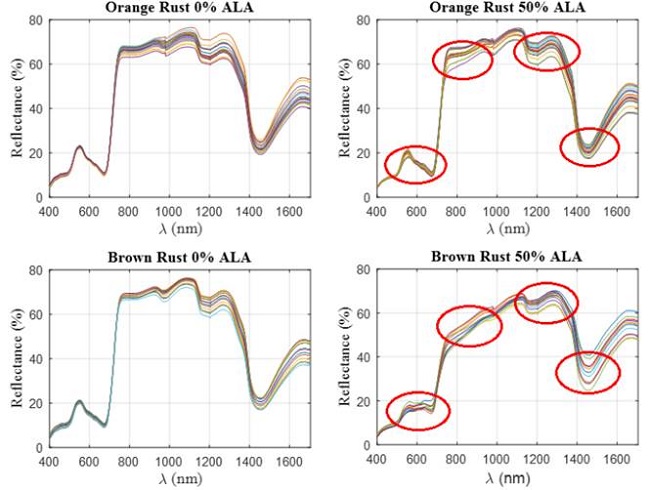 The NDVI calculated from the reflectance values measured by spectrometry shows clear differentiation between healthy and contaminated zones, mainly for brown rust, been greater the index value in healthy areas than in contaminated areas. From Figure 7, the minimum difference between NDVI values in healthy and contaminated areas for the leaves with orange rust is 0.1327, while for the leaves with brown rust is 0.2398.