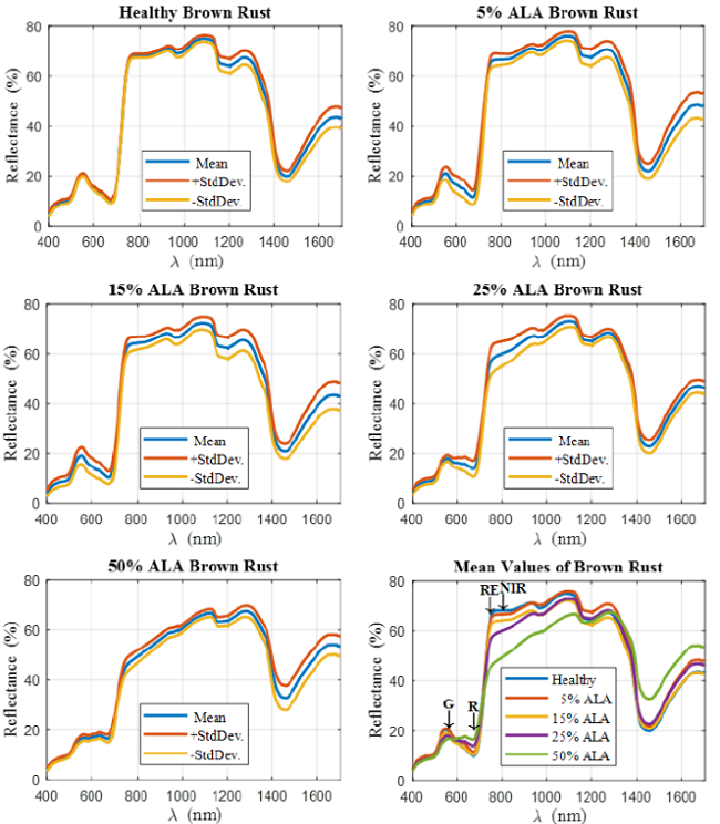 These differences can be better appreciated in Figure 5 for the case of brown rust. In this figure, the mean values and standard deviations of the reflectance values for healthy leaf (0% ALA) are plotted, as well as contaminated in grade 1, 2, 3 and 4 (up to 50% of ALA) with this type of rust. In addition, the mean values of the spectral signatures for the five grade are included in the lower right corner, indicating the wavelength values corresponding to the G, R, RE and NIR sensors of the Parrot Sequoia multi-spectral camera. These mean values and standard deviations were obtained by taking between 17 and 24 readings on each leave. As can be seen, not only is there evidence of the notable difference that spectral signatures have between healthy and contaminated leaves, mainly from 15% of contamination (grade 2 of ALA), but also that in the four monochromatic bands that can sense the Parrot Sequoia multispectral camera most of these differences occur. This same analysis carried out for the leaves contaminated with orange rust shows less significant differences between the different grade of contamination and between these and the healthy leaves.