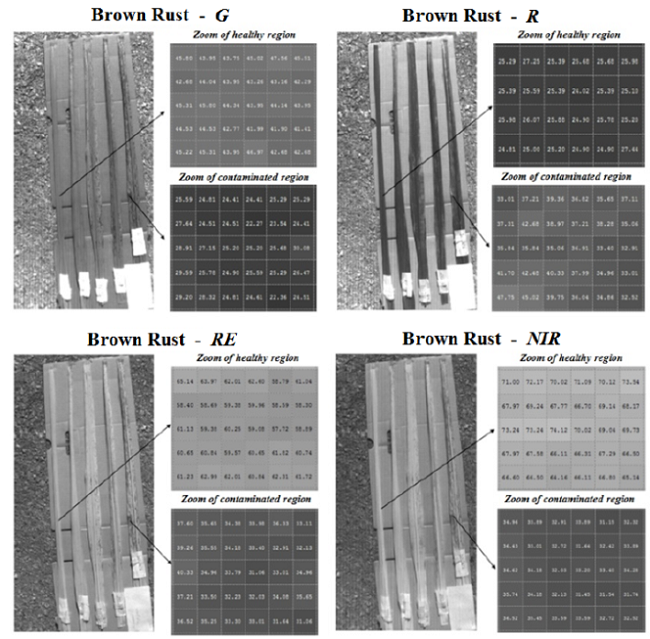 The images obtained did not undergo any adjustment process. As an example, the images in the four multispectral bands obtained from the leaves contaminated with brown rust can be seen in Figure 6 without radiometric correction, as well as the reflectance levels that emit a healthy region of interest and another contaminated region. The radiometric correction can equalize the sunlight used to obtain these multispectral images with the light of the halogen lamp used to obtain the spectral reflectance curves.