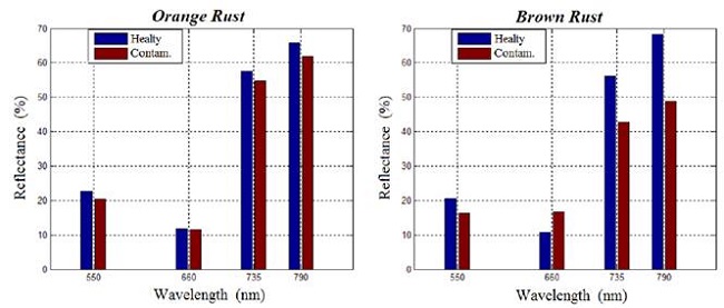 ABSTRACT: Precision agriculture, making use of the spatial and temporal variability of cultivable land, allows farmers to refine fertilization, control field irrigation, estimate planting productivity, and detect pests and disease in crops. To that end, this paper identifies the spectral reflectance signature of brown rust (Puccinia melanocephala) and orange rust (Puccinia kuehnii), which contaminate sugar cane leaves (Saccharum spp.). By means of spectrometry, the mean values and standard deviations of the spectral reflectance signature are obtained for five levels of contamination of the leaves in each type of rust, observing the greatest differences between healthy and diseased leaves in the red (R) and near infrared (NIR) bands. With the results obtained, a multispectral camera was used to obtain images of the leaves and calculate the Normalized Difference Vegetation Index (NDVI). The results identified the presence of both plagues by differentiating healthy from contaminated leaves through the index value with an average difference of 11.9% for brown rust and 9.9% for orange rust.