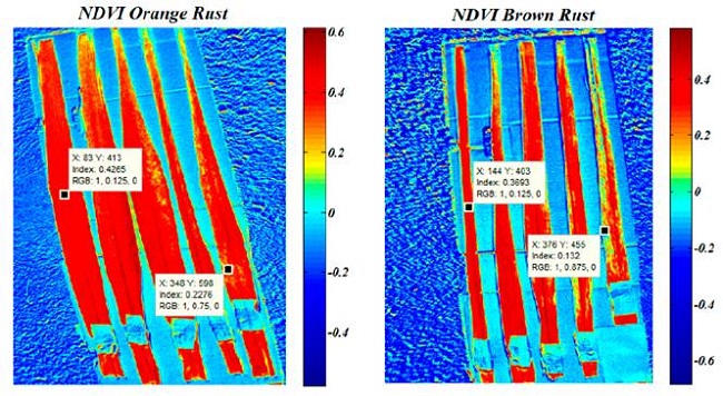 Using the reflectance values obtained by the multispectral images [Figure 6], the NDVI was calculated to obtain the images shown in Figure 8 for both types of rust. In this figure, the numerical values of the NDVI are shown in a pixel of a healthy area and in another of a contaminated area, the numerical difference between these zones being corroborated for both types of rust. In this case, an average difference between points of the uncontaminated leaf and contaminated points of 0.2081 for orange rust and 0.2379 for brown rust is obtained. Taking into account that the NDVI varies between -1 and 1, this represents a ratio of relative decrease of the index between contaminated areas with respect to non-contaminated areas in approximately the 11.9% for brown rust and 9.9% for orange rust.
